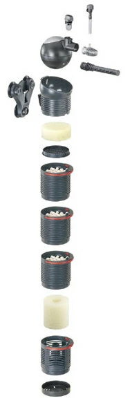– Construction modulaire avec paniers filtrants fermés, remplis de EHEIM SUBSTRATpro; Panier d’entrée avec cartouche filtrante (d’autres matériaux filtrants peuvent également être utilisés)