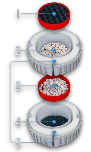-Les paniers de filtration amovibles et empilables empêchent la dérivation de l’eau et ont une contenance en masses filtrantes de 3,9 L (1 gal US).